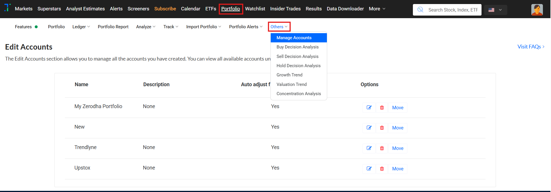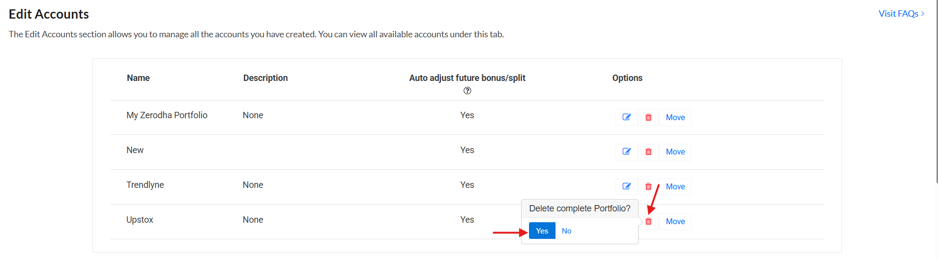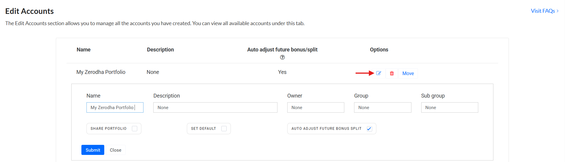 1. You can edit or change the name of your portfolio account by clicking the Edit (pencil) icon next to the account you want to update, as shown in the image below.