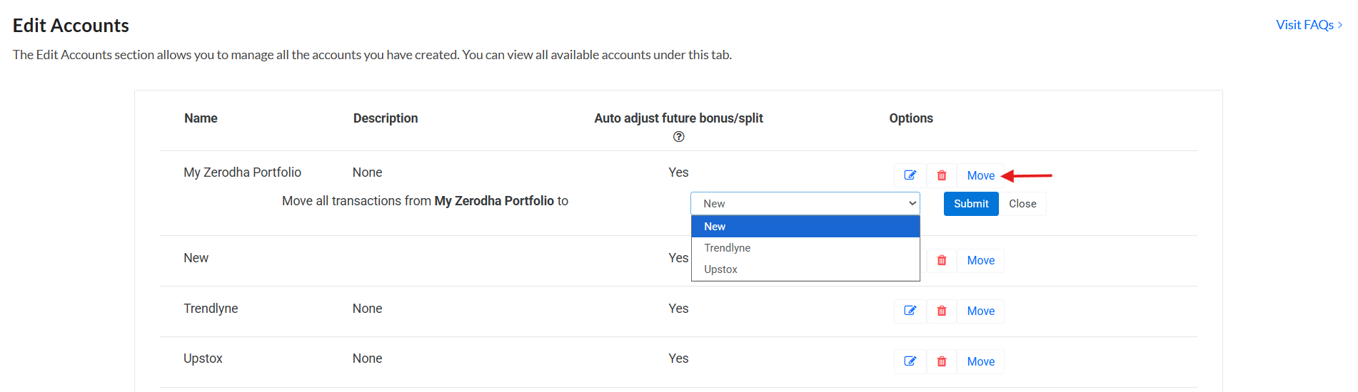 2. You can transfer your holdings to a different account using the 'Move' option.