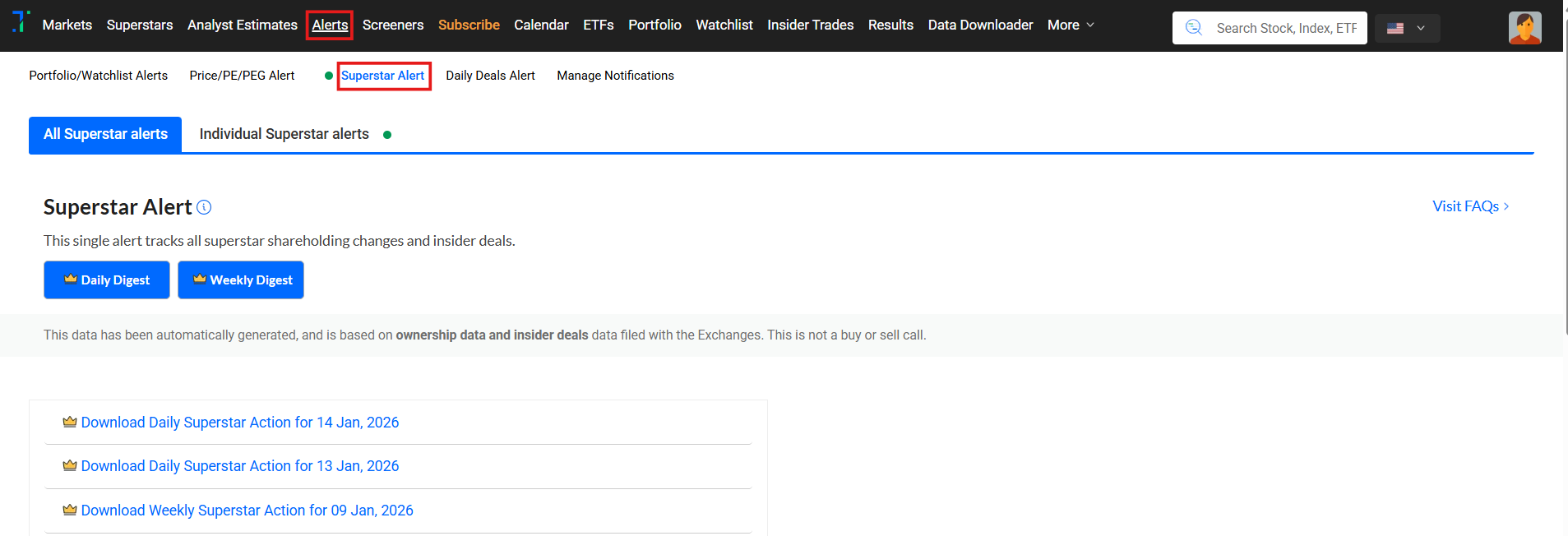 The Superstar Alert sends you information on shareholding changes, shareholding patterns, and any Insider deals executed by superstars. This alert can be configured to trigger on an hourly, daily, and weekly basis.
