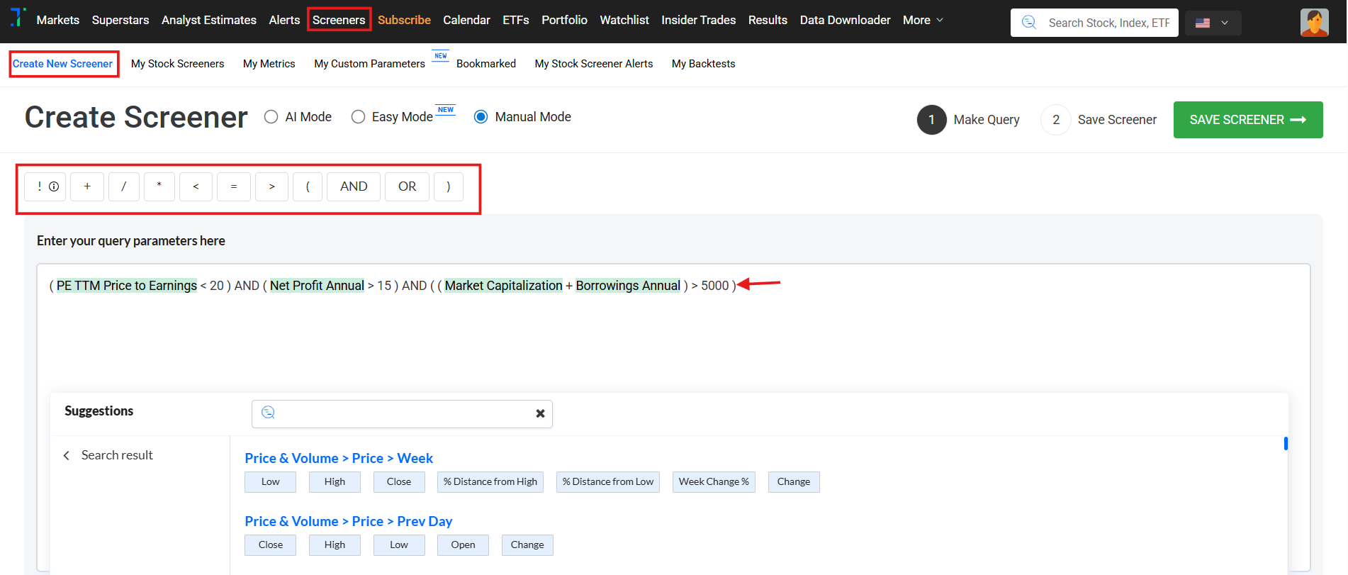 A screener query combines parameters and conditions to set up specific search criteria in a list of stocks. Trendlyne’s screener query tool is especially flexible, allowing you to build a screener query using both conditional and mathematical filters (greater than, less than, addition, division, etc)